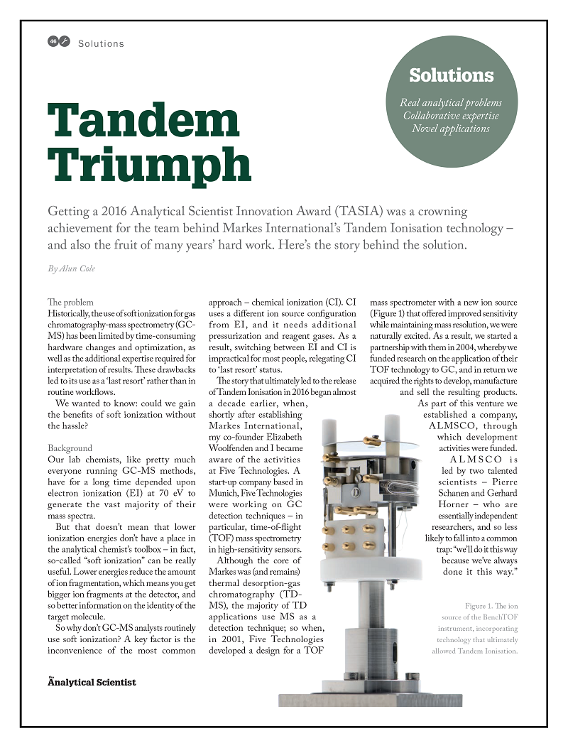 The article, written by the co-founder of Markes International, Alun Cole, explains how the idea for improving the sensitivity of low-energy electron ionisation came about, and how it was first commercialised as Select-eV for Markes' range of BenchTOF time-of-flight mass spectrometers. He then goes on to highlight how the product evolved into Tandem Ionisation, and how the success of this product was recognised with an innovation award in 2016.