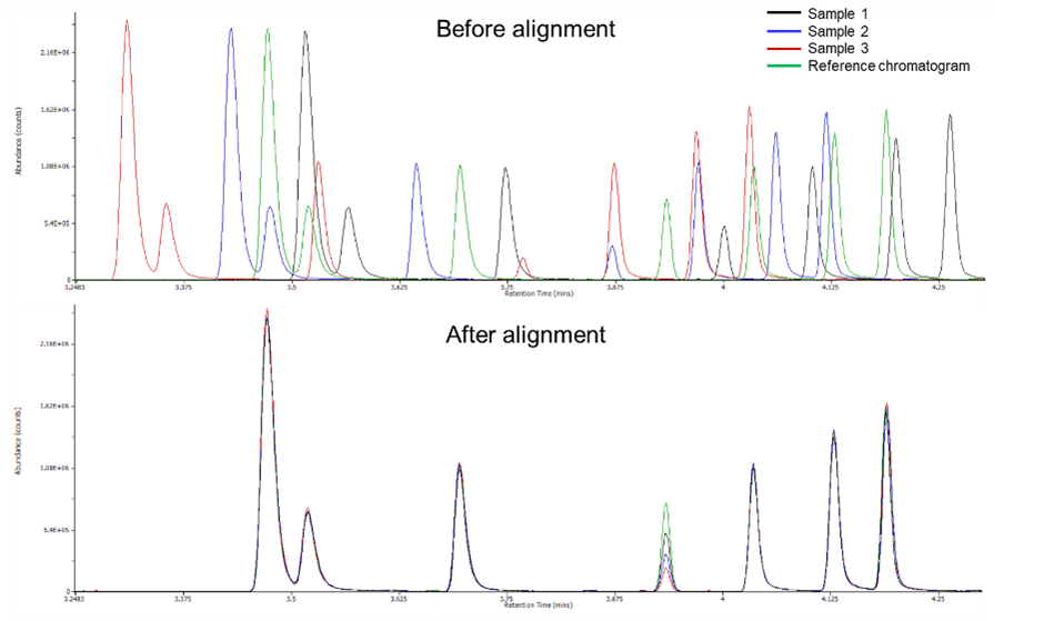 Chromatographic alignment is the obvious solution to these difficulties, but many of the reported algorithms rely on time-consuming manual processes, exceptionally complex scripts including a host of user-defined options, or are restricted to shifts of just ±10 seconds, which isn’t helpful in many real cases and has prevented their widespread adoption.