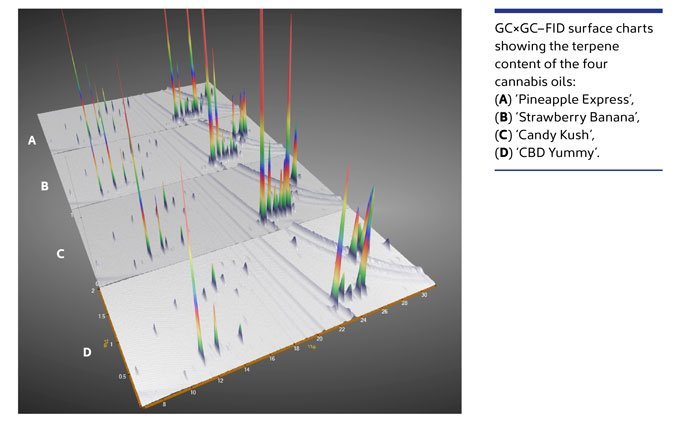 The terpene content of the four cannabis oils was analysed (above), and the enhanced separation of GCxGC was found to resolve co-elutions that would have occurred in conventional 1D GC analyses, avoiding the associated over-estimation of analyte concentrations.
