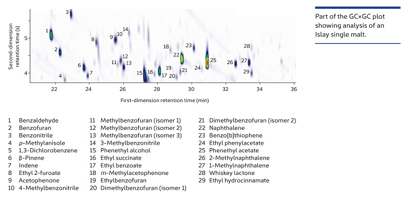 This study demonstrates the high performance of a flow-modulated GCxGC–TOF MS system, coupled with sample preparation by solid-phase micro-extraction (SPME), for the separation and identification of trace volatiles in three brands of whisky.