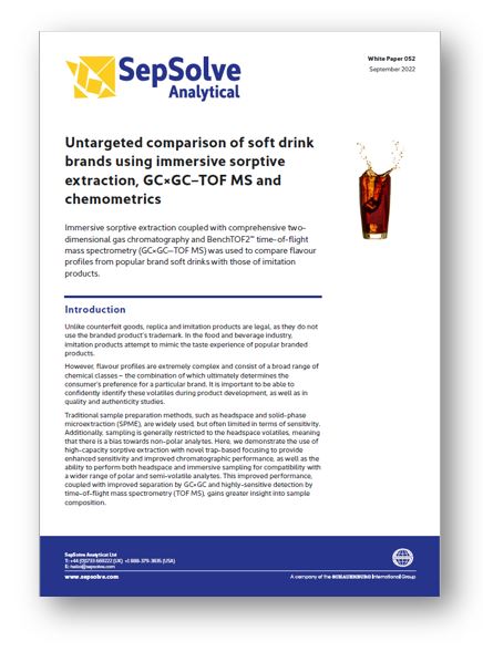 Untargeted comparison of soft drink brands using immersive sorptive extraction, GC×GC–TOF MS and chemometrics Immersive sorptive extraction coupled with comprehensive two-dimensional gas chromatography and BenchTOF2™ time-of-flight mass spectrometry (GC×GC—TOF MS) was used to compare flavour profiles from popular brand soft drinks with those of imitation products. The HiSorb high-capacity sorptive extraction probes used in the study not only offer a larger volume of sorptive phase compared to traditional solid-phase microextraction for higher sample loadings, but their robust design also enables immersive sampling. Coupling this high-sensitivity extraction with GC×GC–TOF MS ensures that a wide range of chemical classes is efficiently separated and confidently identified. Please complete the form below to download the full white paper.