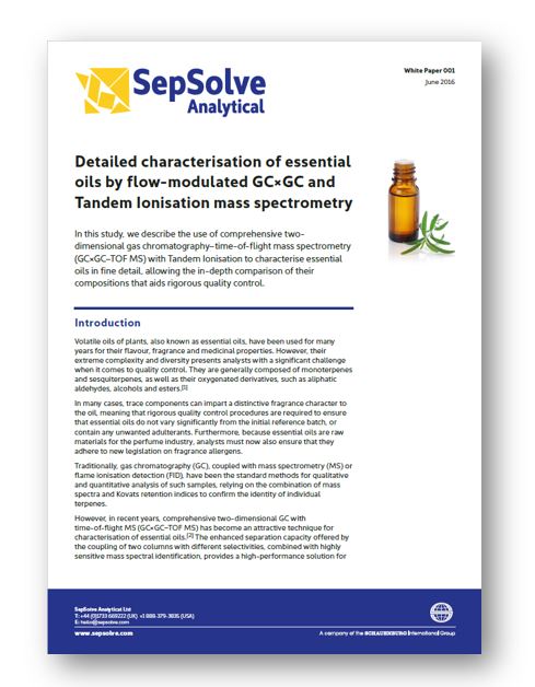 In this study, flow-modulated GCxGC–TOF MS with Tandem Ionisation is used to characterise essential oils in fine detail, allowing the in-depth comparison of their compositions that aids rigorous quality control, particularly in the fragrance industry.
