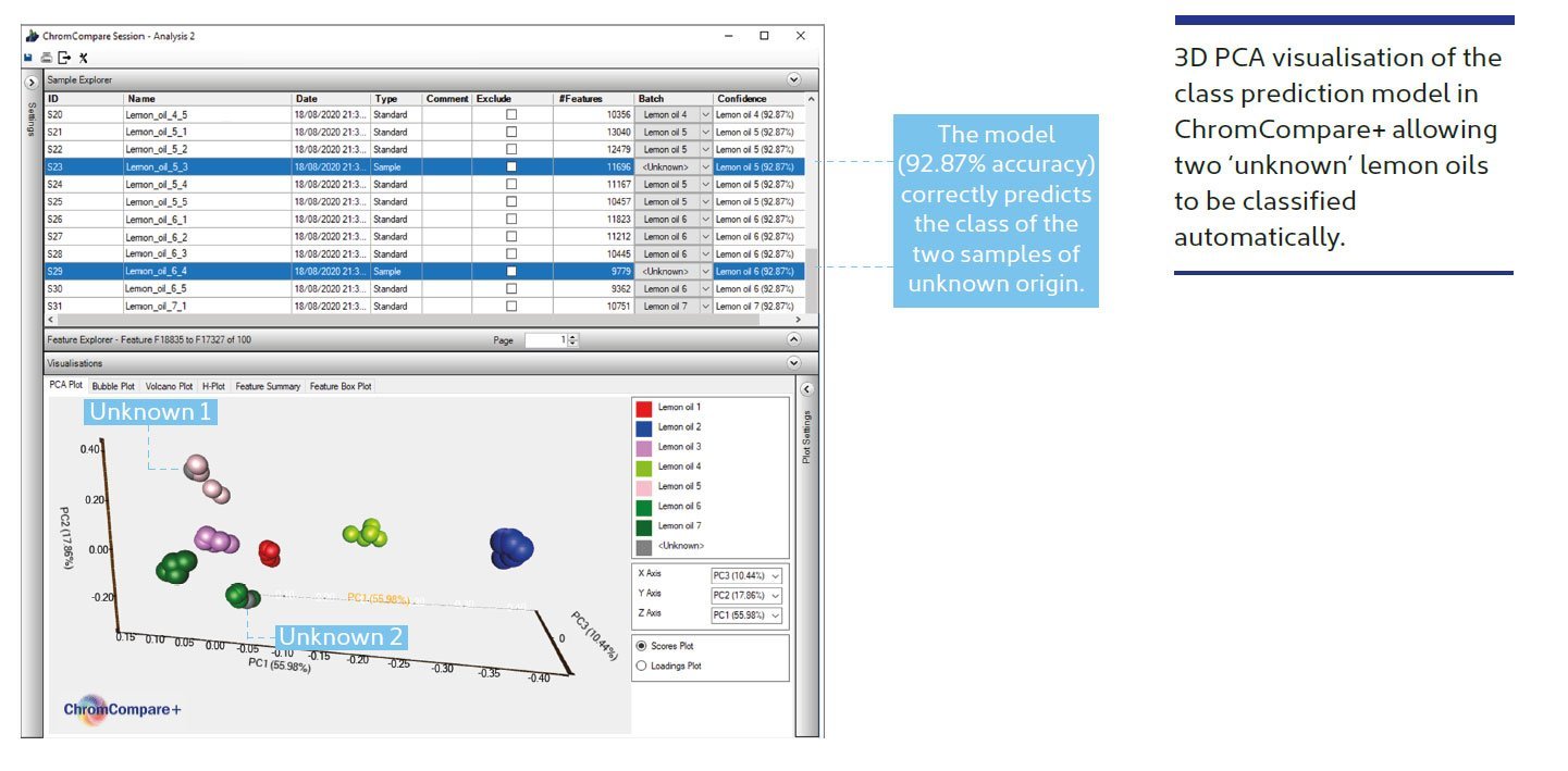 Here, we will demonstrate the use of ChromCompare+ software to identify significant differences between batches of lemon oils using all of the raw GC–MS data. This innovative approach will be shown to minimise laborious pre-processing steps, reduce the risk of missing important details and enable simple classification of unknown samples.