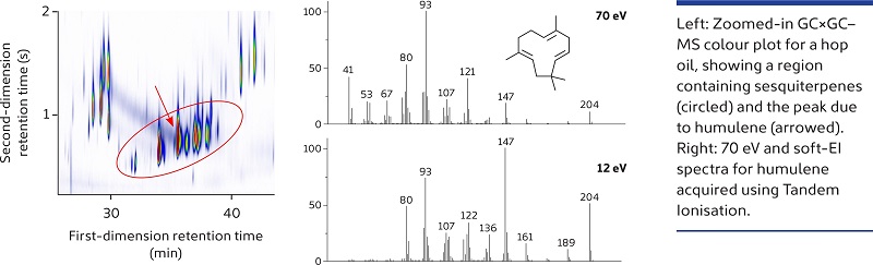 In addition, the Tandem Ionisation capability of BenchTOF instruments provides additional information that is valuable for analyte speciation, by generating conventional 70 eV and soft-EI spectra simultaneously across every peak.