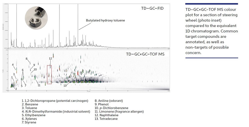 This study demonstrates the discovery of odour compounds using thermal desorption with GCxGC–TOF MS. This provides target and non-target screening of car trim components on a single platform, for advanced analysis of vehicle interior air quality (VIAQ).