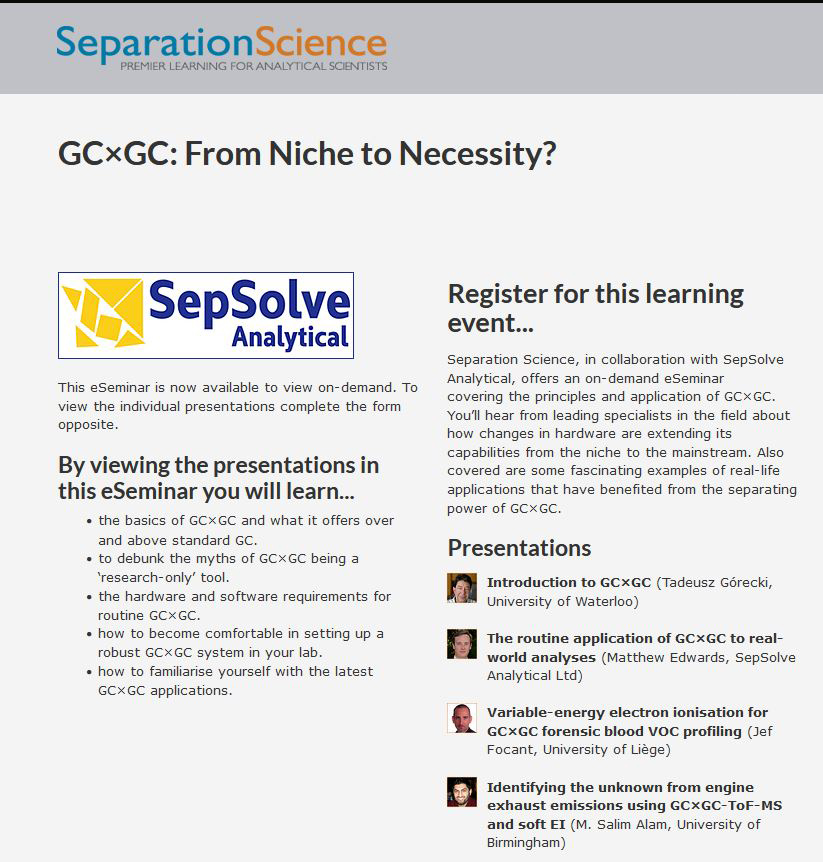 SepSolve Analytical, in collaboration with Separation Science, is offering an eSeminar covering the principles and applications of two-dimensional gas chromatography (GCxGC). See below for details of the presentations, which are all available to view on-demand.